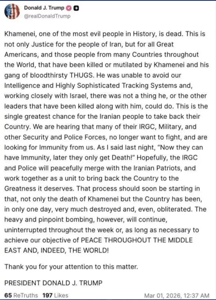 Jamenei, una de las personas más malvadas de la Historia, está muerto. Esto no solo es justicia para el pueblo de Irán, sino también para todos los grandes estadounidenses y para aquellas personas de muchos países alrededor del mundo que han sido asesinadas o mutiladas por Jamenei y su pandilla de MATONES sedientos de sangre. No pudo evitar nuestros sistemas de inteligencia y de rastreo altamente sofisticados y, trabajando estrechamente con Israel, no hubo nada que él, ni los otros líderes que fueron eliminados junto con él, pudieran hacer. Esta es la mayor oportunidad para que el pueblo iraní recupere su país. Estamos escuchando que muchos de su IRGC, militares y otras fuerzas de seguridad y policía, ya no quieren luchar y están buscando inmunidad de nuestra parte. Como dije anoche: “Ahora pueden tener inmunidad, ¡más tarde solo obtendrán la muerte!”. Con suerte, el IRGC y la policía se fusionarán pacíficamente con los patriotas iraníes y trabajarán juntos como una unidad para devolverle al país la grandeza que merece. Ese proceso debería comenzar pronto, ya que no solo la muerte de Jamenei, sino que el país ha sido, en solo un día, muy destruido e incluso devastado. Los bombardeos intensos y de precisión, sin embargo, continuarán sin interrupción durante la semana o el tiempo que sea necesario para lograr nuestro objetivo de PAZ EN TODO EL MEDIO ORIENTE Y, DE HECHO, EN EL MUNDO. Gracias por su atención a este asunto.