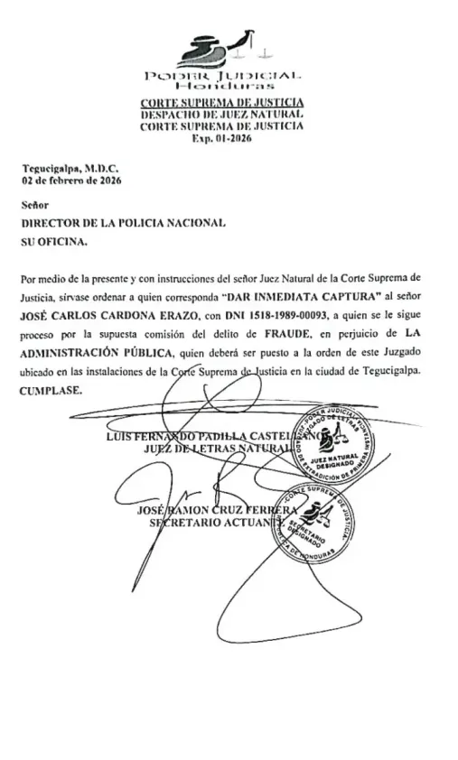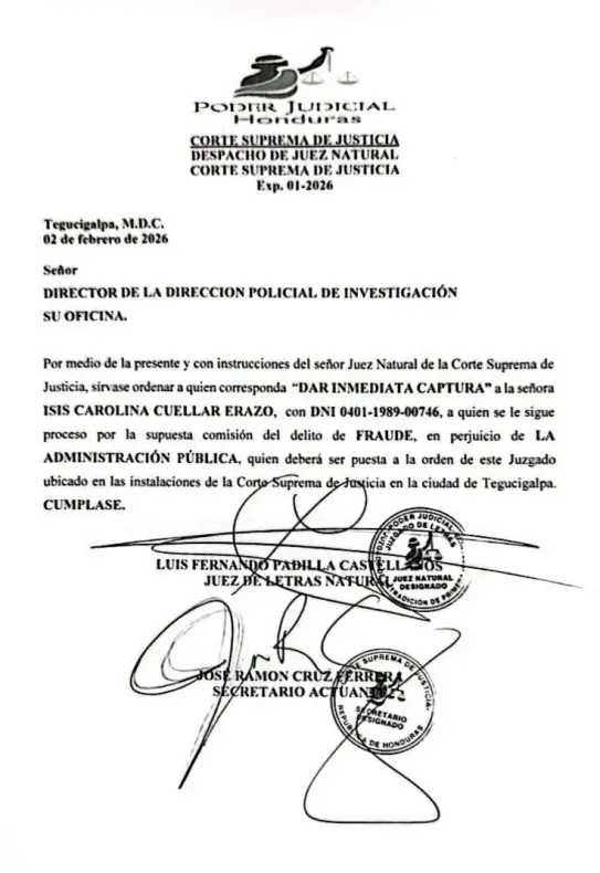 Tegucigalpa, Honduras. La Corte Suprema de Justicia de Honduras libró este lunes órdenes de captura contra la diputada Isis Carolina Cuéllar Erazo y el exministro de Desarrollo Social José Carlos Cardona Erazo, tras la presentación de un requerimiento fiscal por parte del Ministerio Público de Honduras.